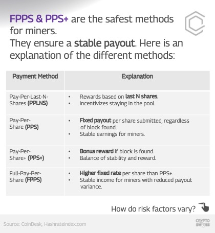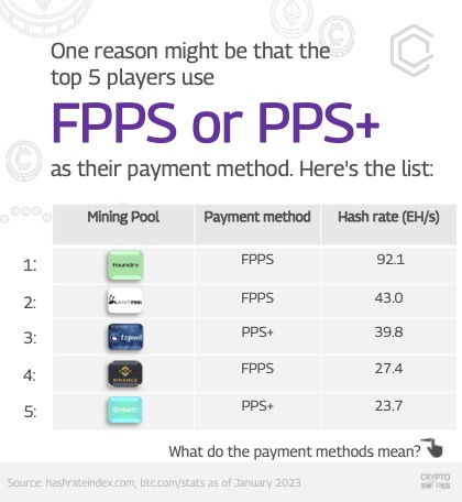 One possible reason is that the top 5 players use Full-Pay-Per-Share (FPPS) or Pay-Per-Share+ (PPS+) as their payment method. These payment methods are considered to be the safest for miners, as they ensure a stable payout regardless of any blockchain reward variance. As risks lie with mining pools, they need to be big to run profitably. The risk management is critical for Bitcoin miners, and they prioritize safety by picking big players. The FPPS and PPS+ methods ensure a stable payout, which is why they are the preferred methods for the majority of mining pools.